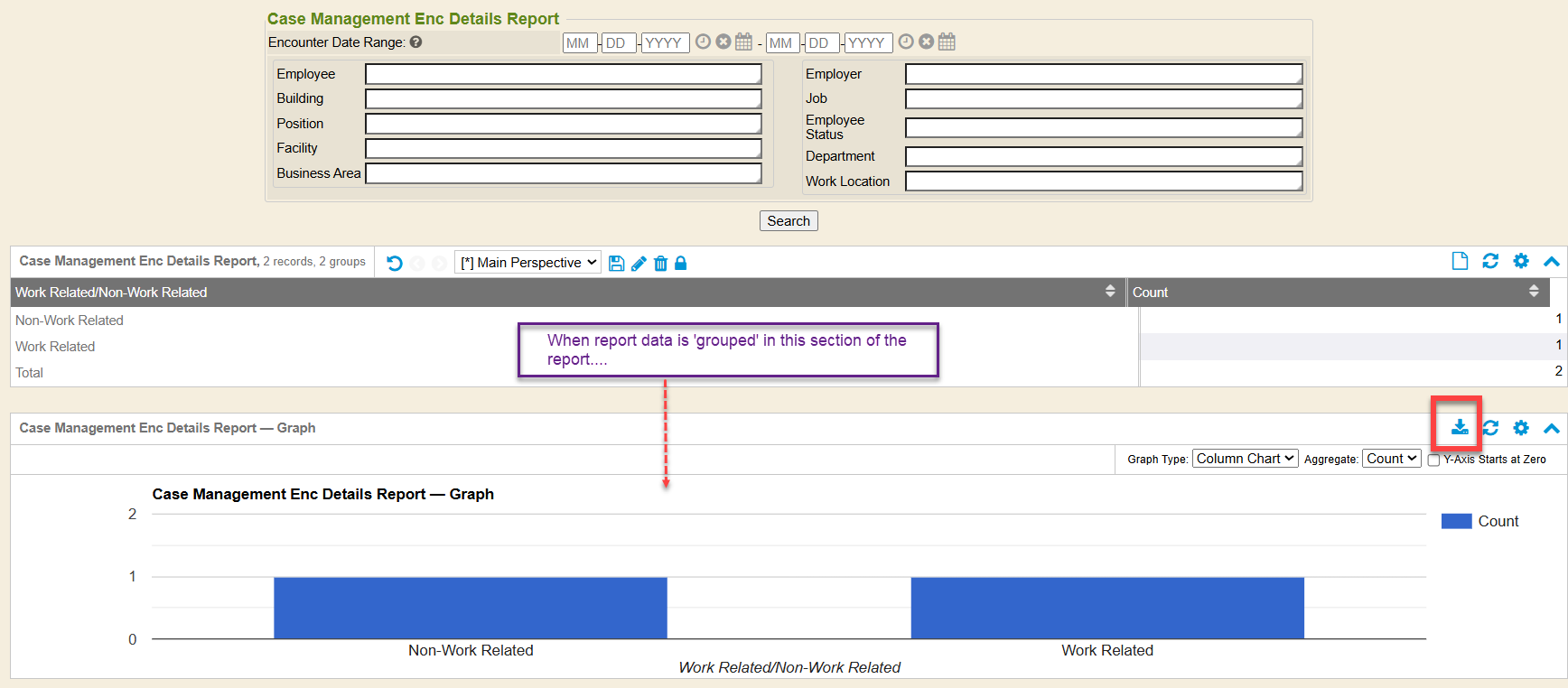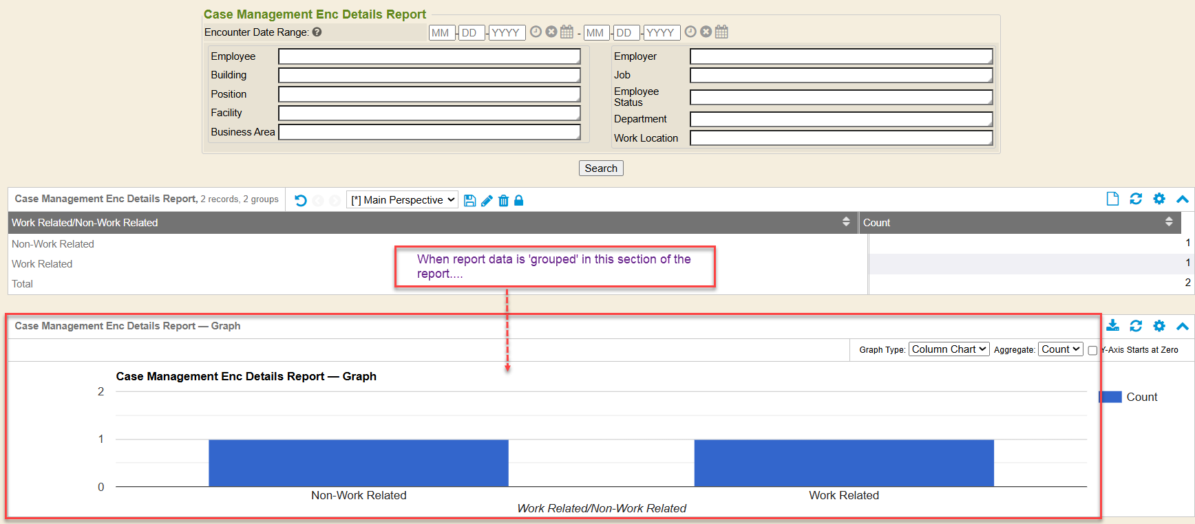 If report data in the Case Management Enc Details Report section of the output is grouped, then the subsequent section titled *Case Management Enc Details Report-Graph* will output a graph. The user can select the Graph Type from the drop-down to change the graph shown.