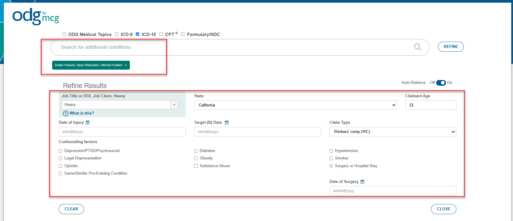 Once successfully logged into the ODG system via the Open ODG button in Enterprise Health , you can manually key in any data and include any refinement. See ODG's [How to Use the Duration Tab](https://www.mcg.com/odg/wp-content/uploads/sites/2/2025/09/HowToUseTheODGDurationTab.pdf) self training PDF guide.