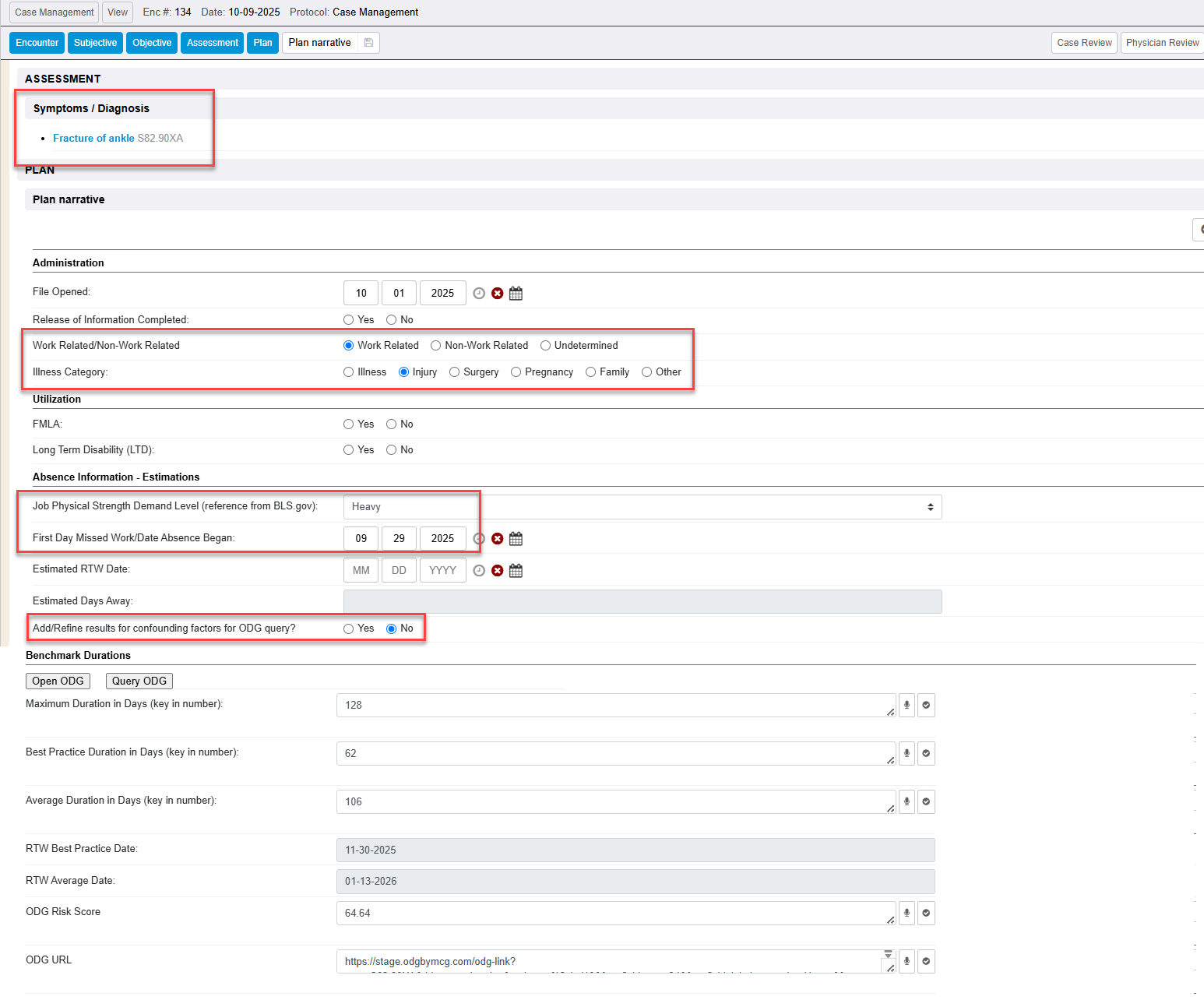 An integration between Enterprise Health and [ODG by MCG ](https://www.mcg.com/odg/)is available in the 2025-09RC. This integration can improve patient outcomes, reduce administrative costs, and streamline workflows by aligning with industry-standard guidelines. Integration with the ODG by MCG system to access evidence-based guidelines, benchmarking tools, and predictive modeling for best practice and average or maximum days away from work, improving return-to-work (RTW) timelines, medical costs, and quality of care. This integration provides a common framework based on extensive historical claims data (over 10 million lost-time cases), which helps manage costs, reduce inappropriate medical utilization, decrease indemnity costs, and improve worker and patient outcomes.