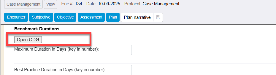 The *Open ODG* button within the Plan Narrative flowsheet section of a Case Management encounter (utilizing the Chief Complaint protocol of Case Management) will be accessible with or without an ODG integration into your Enterprise Health system.