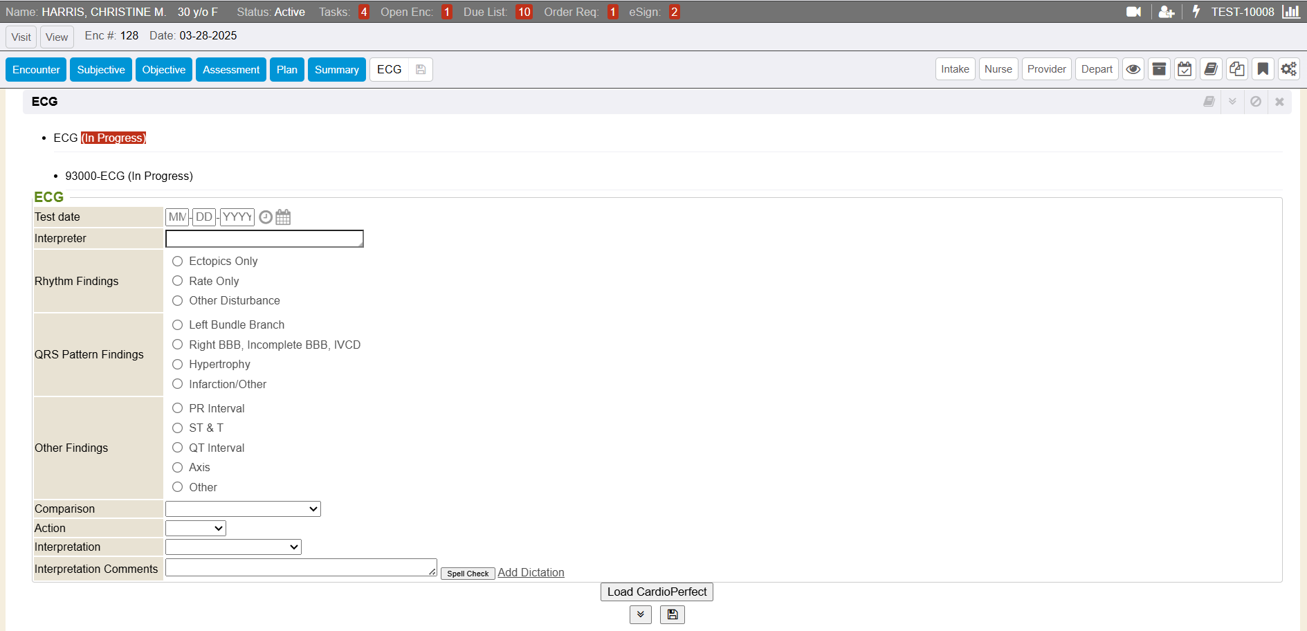 Once the EKG test/procedure has been applied to the encounter, EKG data fields open for data entry in the visit encounter.