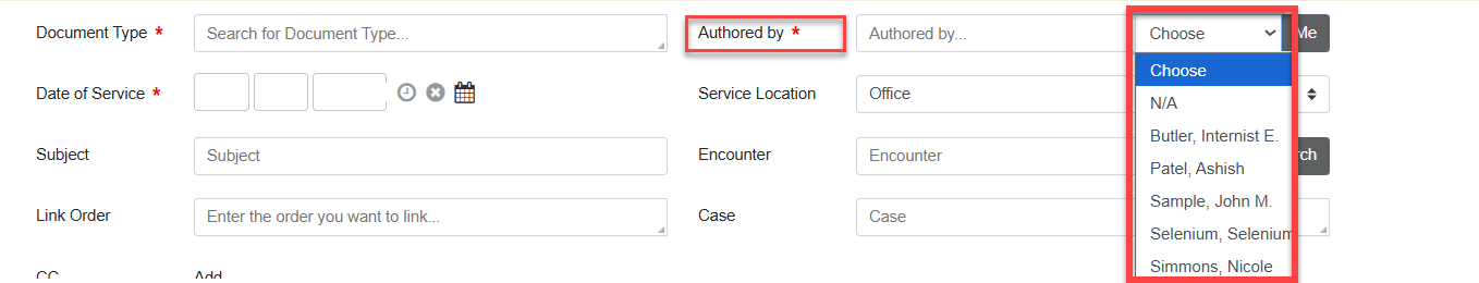 - Authored By: This is a required field. Given the proper security permission, select for whom this file document is authored by or click the Me button if the logged-in user is the author. The logged-in user uploading a file document into the chart is considered the Creator and will be logged as such in the document properties. Authored By is who authored the specific document being uploaded.