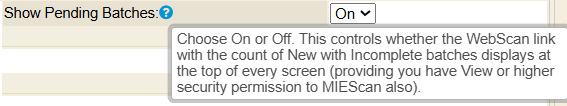 My Settings Preference Show Pending Batches: If your My Settings Preference for Show Pending Batches is On (and you have security permission to at least view MIEScan), the system will display the WebScan (x) count hyperlink at the top of every screen.