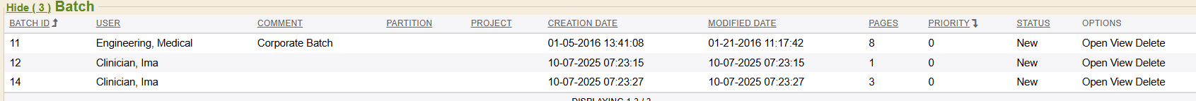 - Options: Quick links for performing necessary actions when managing batches. Options include Open, View, and Delete.