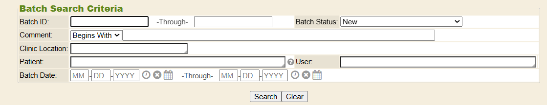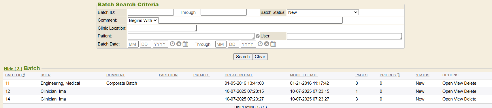 The WebScan module will display all New batches, by default. However, a user may search for a batch by its batch ID number, its comments, a specific patient or user, or the batch date. Use the search filters to narrow search results, and after clicking the Search button, matching results will populate below the search in a ListView.