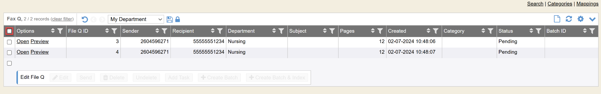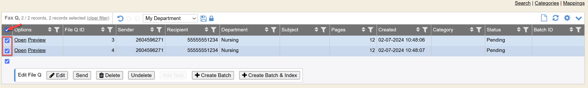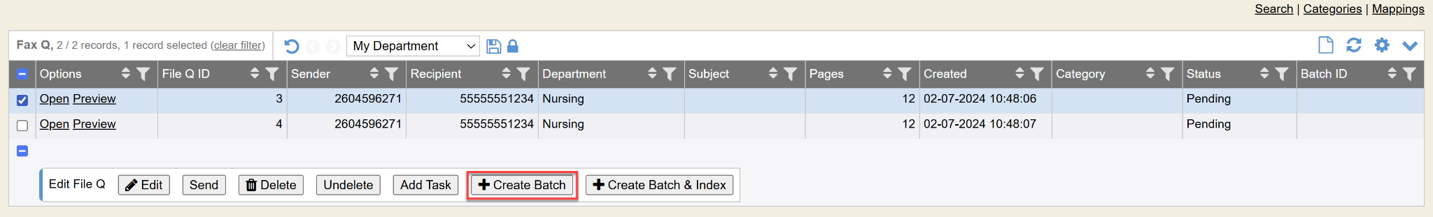 If you previewed/read the faxes/files, you can check-mark the files that you want to process in bulk and can simply check-mark the boxes and then select Create Batch button at the top. These are quick links to process/distribute faxes that you know for sure should be processed by those methods.