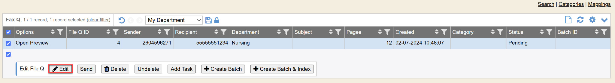 If you need to move a fax back into the “inbox” category/bucket, simply checkmark and click the Edit button on the fax you need to move back and in the drop-down select the “Select a Category” option and then click the Save button. This will now move that fax(es) back into the main “inbox” bucket/category.