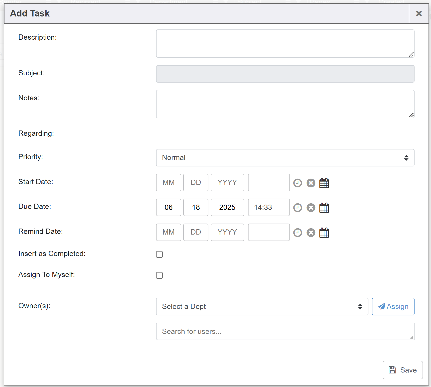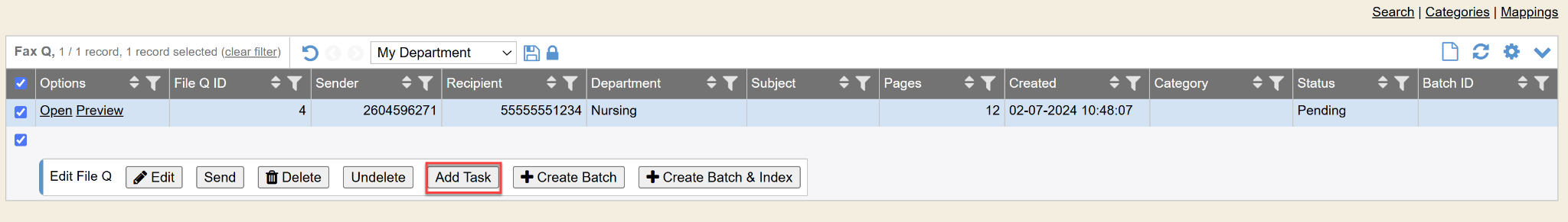 - Add Task: You can task a file/fax using a fast task template that is set up for IFQ. Select the file (checkmark it) and then click the Task button at the top.