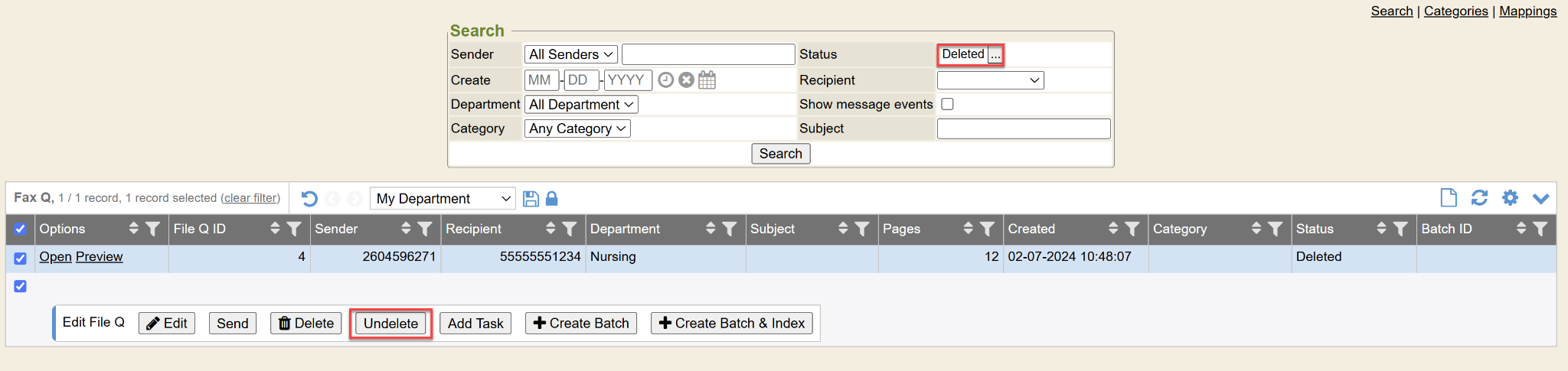 - “Deleted” means the faxes in this category were deleted by a user in the Fax/file Q. They were not needed for a chart; they are faxes of junk, etc. The system is usually set to purge these deleted faxes in 180 days, however contact your MIE Implementer to find out. They cannot be retrieved after that purged date. Your MIE Implementer can change the system setting to a different number of days to purge the deleted faxes if you wish.