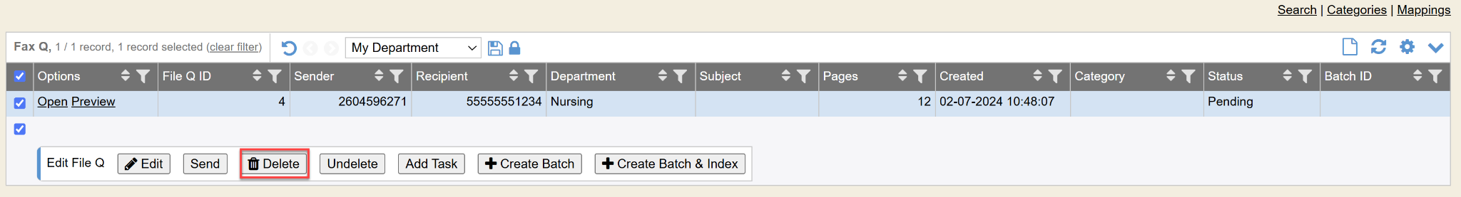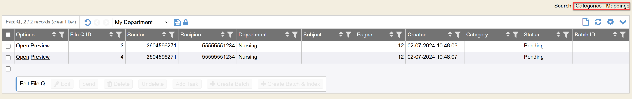 - Categories: You can add, delete, and manage Fax/file Q categories from here. A category cannot be deleted if there are files/faxes still housed in that category. You would need to move them first.