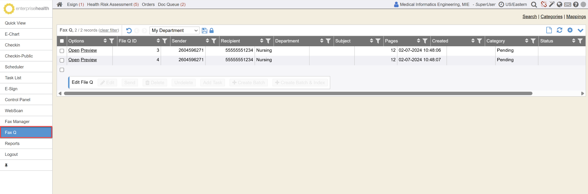 Incoming faxes for certain fax numbers can be found within Enterprise Health , by clicking on the Fax Q tab on the left sidebar menu. (Your system may have this named differently to whatever you wish). This will automatically default to open and show the “Pending” status faxes in the Fax queue.