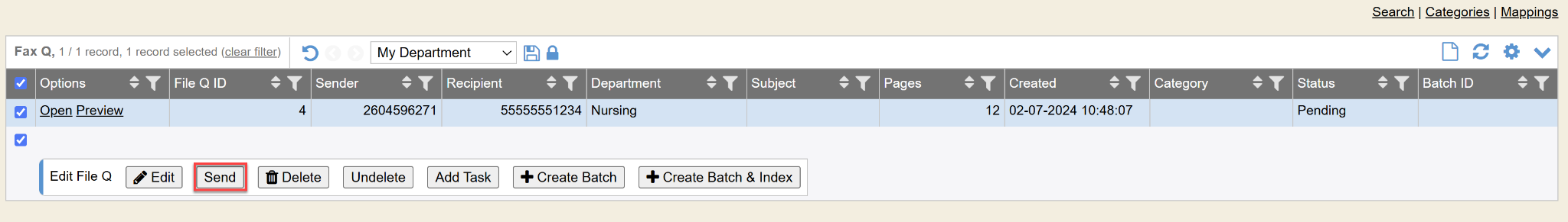 - Send: Click this button and select the Department you wish to be assigned this Fax.