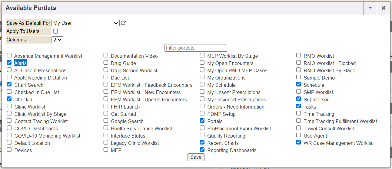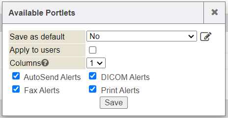 If you do not see the ALERTS module in the Quick View tab, simply click Select Portlets from this tab and checkmark the section named Alerts, then save your Quick View tab portlets. The portlets you have check-marked will display on your Quick View screen and you can move them around in the order you wish to display for your view. This is similar to the Interactive Patient Summary tab. (See additional help on how to move modules around, set columns and collapse these modules on your screen view in our Interactive Summary Patient Chart Tab online help documentation).