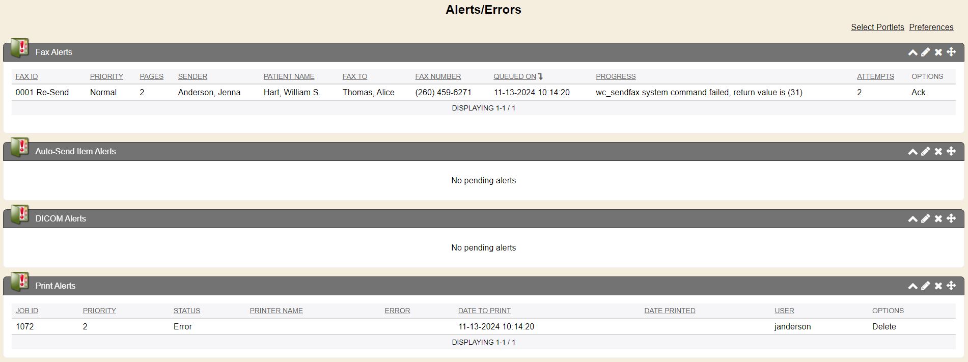The fax alerts portlet shows any failed faxes, based on your preference that rendered from Enterprise Health . You can re-send the fax. acknowledge or stop fax from this screen. You can also click the Manage Information icon from the top right of this Fax Alert portlet.