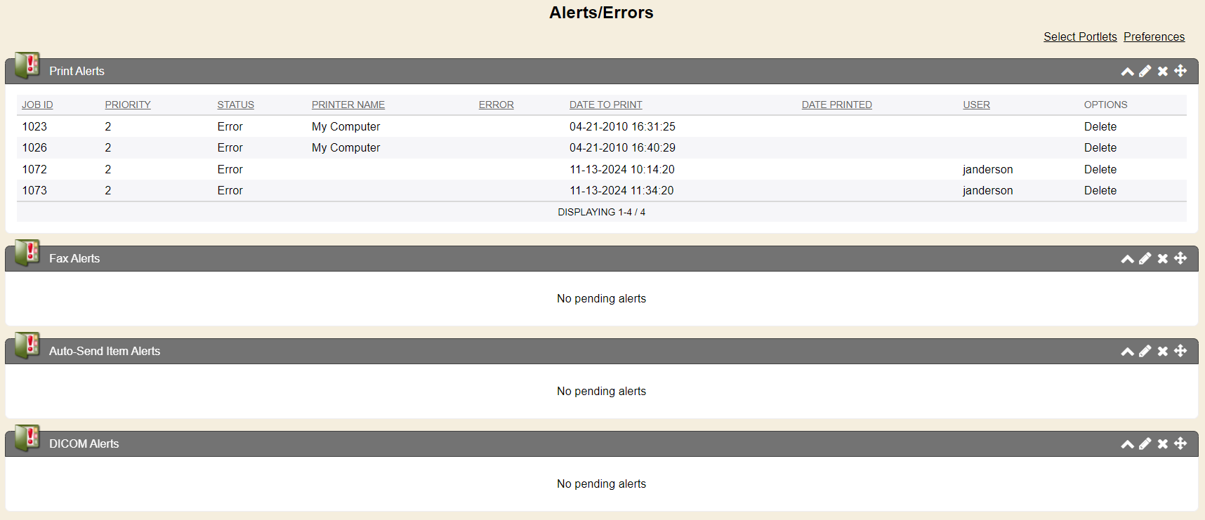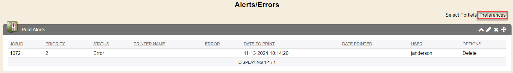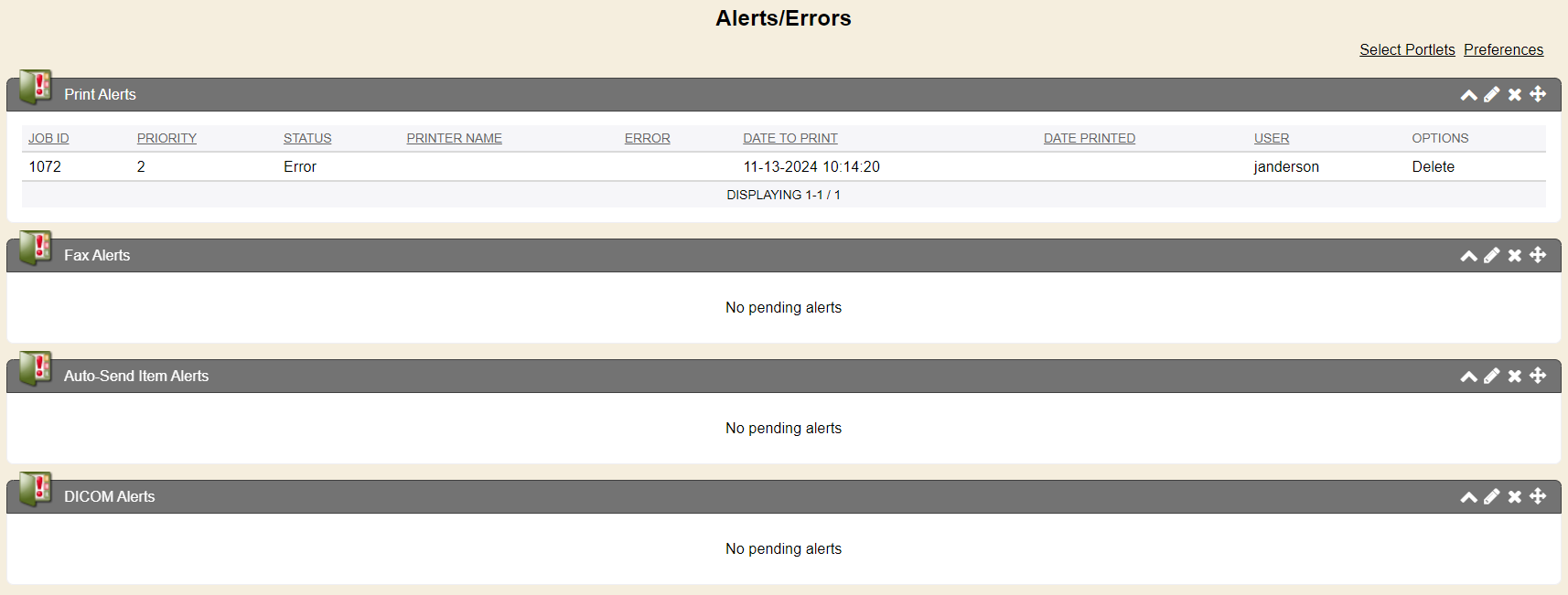 The print alerts portlet shows any print jobs, based on your preference that rendered from Enterprise Health and failed. You can view the specific failed print jobs from this screen and click the job id to see the specific print job. And you can delete the print job from here. You can also click the Manage Information icon from the top right of this Print Alert portlet.