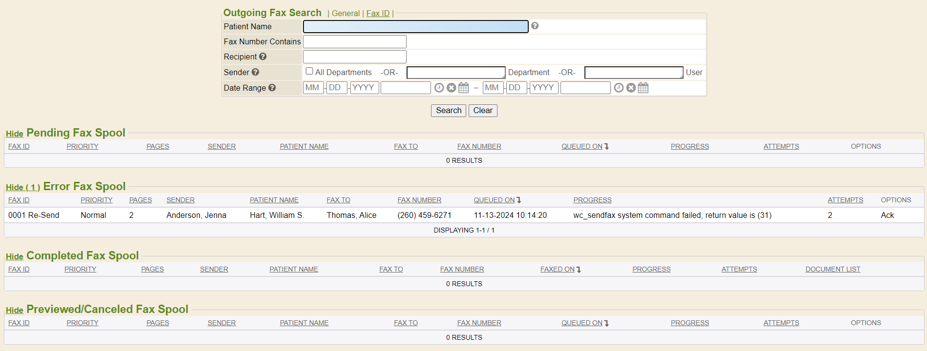 If you click the Manage Information icon, it will take you to the Fax Manager tab. This is where you can then see the ERROR FAX SPOOL category and listing in full and other specific options to work the failed fax. For more information on this screen and how to work failed faxes, see our Fax Manager Tab-Outbound Faxing help documentation.