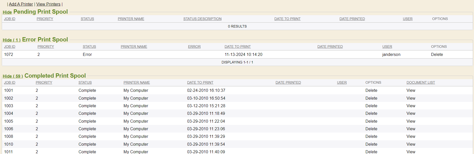 If you click the Manage Information icon, it will take you to the Print Manager tab. This is where you can then see the ERROR PRINT SPOOL category and listing in full and can click on the job id to see the specific print job and reprint or use the delete option to delete the failed print job.