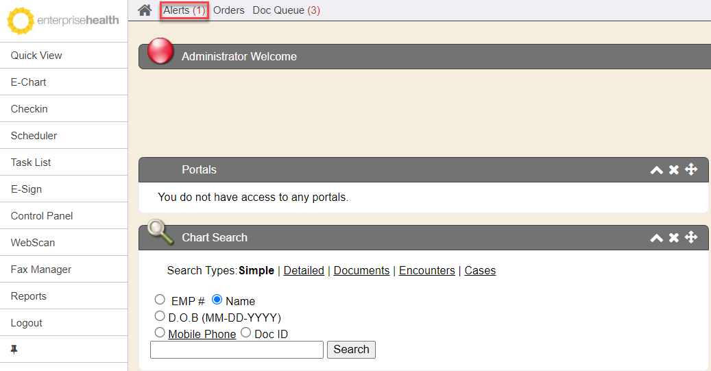 The Alert feature can also be found and accessed in the Quick View sidemenu tab page. However, your Enterprise Health system may not have this sidemenu tab named Quick View. Contact your MIE Implementer if you wish to have that sidemenu tab programmed onto your system. Otherwise, the only way to access Alert/Errors is by the alerts link at the top toolbar.