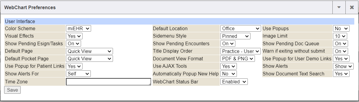 Once you click the preferences link, some Enterprise Health preference settings will display and you can change your selections and click the SAVE button. The two preferences that are tied to this Alerts/Errors screen are the Show Alerts and the Show Alerts For preferences.