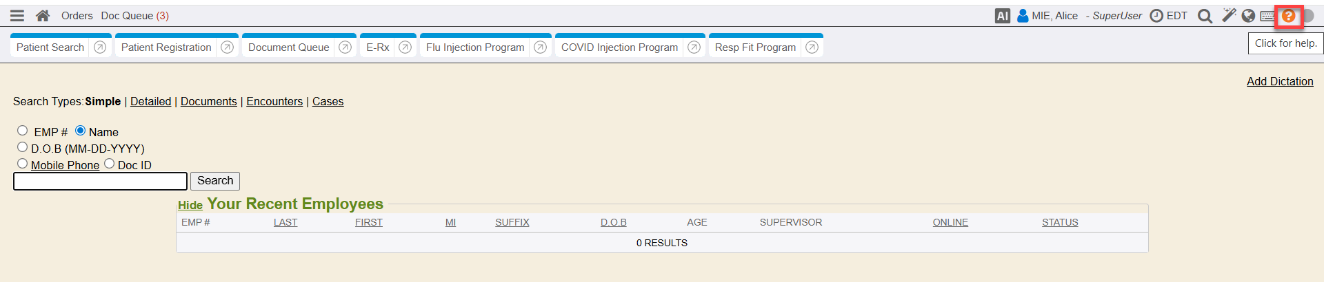 If desired, the system can be configured to turn off the Search by Social Security Number option. This will remove the SSN search ability from the Simple and Detailed chart search screens. It will also remove the Social Security column from the Recent Employees/Patients listing. To turn off the social security search option in other modules or layouts, please contact MIE for assistance.
