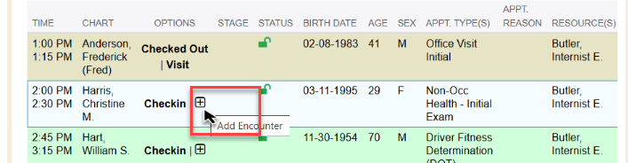 - [+] icon: Allows users to only create/add the encounter (that is configured to that specific appointment type) and does not check the chart in for their scheduled appointment. This may be used when needing to prepare the encounter for the appointment, but not check the person in for their appointment yet. When the + icon is selected, the associated encounter, if configured, will automatically be created & will open and the user will be redirected to the opened encounter. The Encounter section will default the encounter to the date/time of the scheduled appointment (NOT the date/time the encounter was created/opened), as well as display the linked appointment type. If the patient is later checked in, and an encounter was previously created/opened using this [+] icon, a second encounter will not be created. The user will be directed to the existing encounter. If an encounter was not previously opened at the time of check in, then the existing functionality has not changed. In this case, any associated encounter will automatically be opened for the user upon Checkin.
