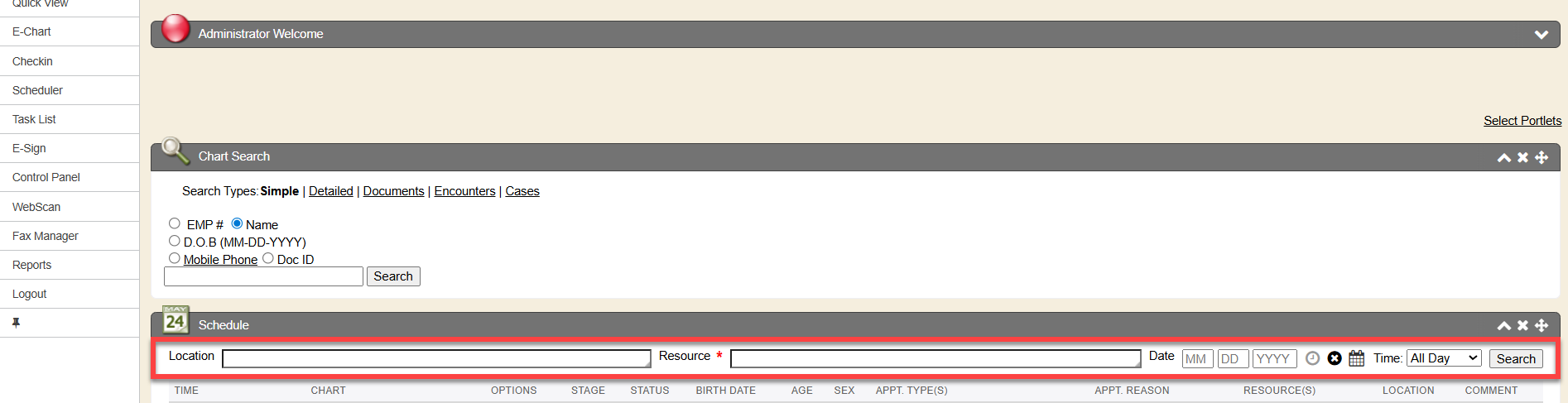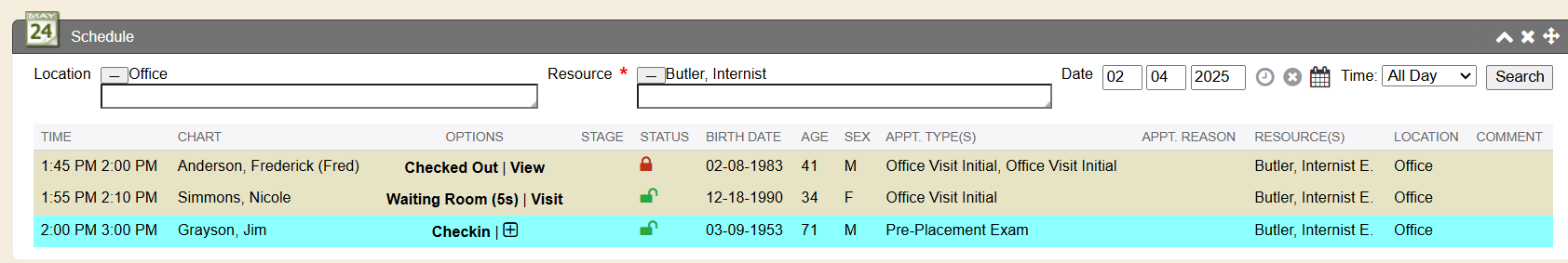 The Location and Resource are autocomplete fields in which users may select one or multiple locations and resources. The Resource field is required when searching for scheduled appointments. The Date entered should be the date the user wishes to view the scheduled appointments for but will prepopulate with today’s date. Users may search for today or for dates in the past or future. Once search criteria has been entered, click the Search button to display the schedule.