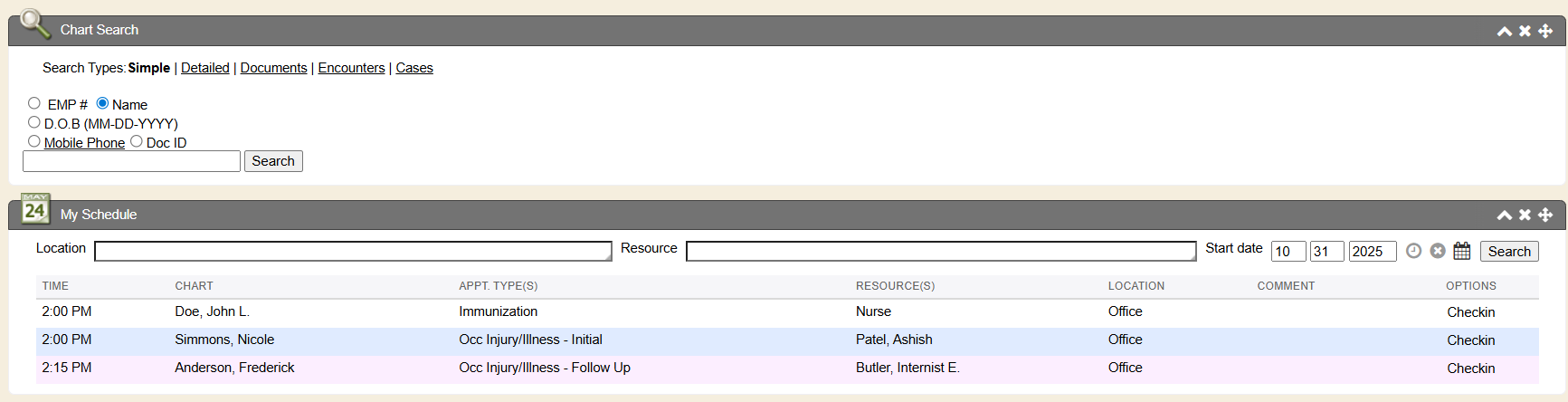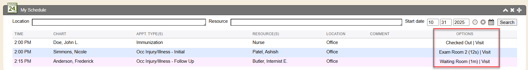 - Checked Out hyperlink: Signifies the chart has been marked as checked out for their appointment. If needed, can click on the Checked Out hyperlink to check them in again.
