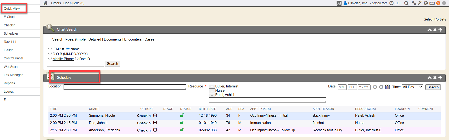- Checkin Station Name hyperlink: Displays the various station names of where the person is at the moment at the clinic (and how long they’ve been in that station). As patients move through their visit, stations may change and update here. This is a quick visual to see ‘where’ physically the patient is in your clinic. The station is a hyperlink that can be clicked here to quickly move the patient to another station as needed, from this portlet.