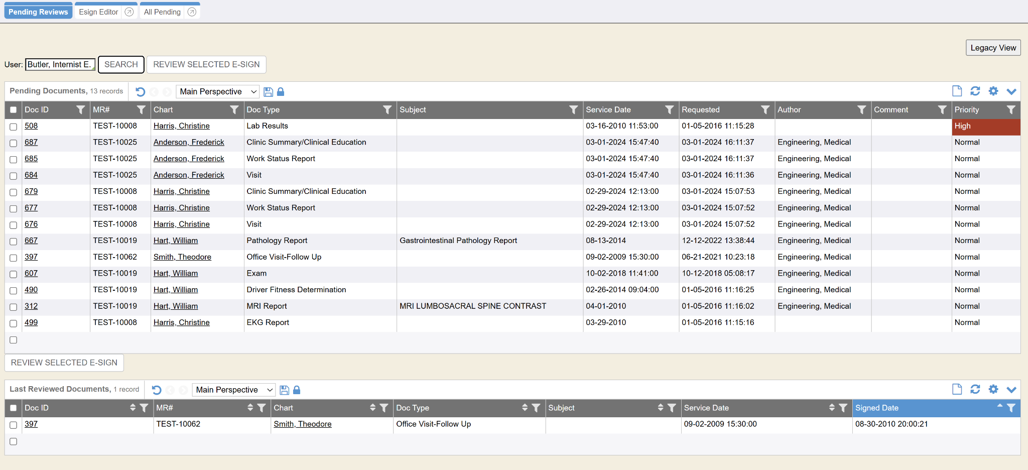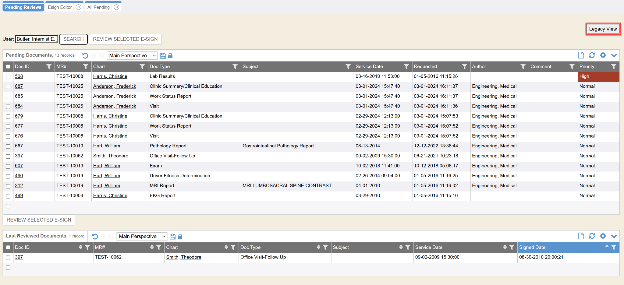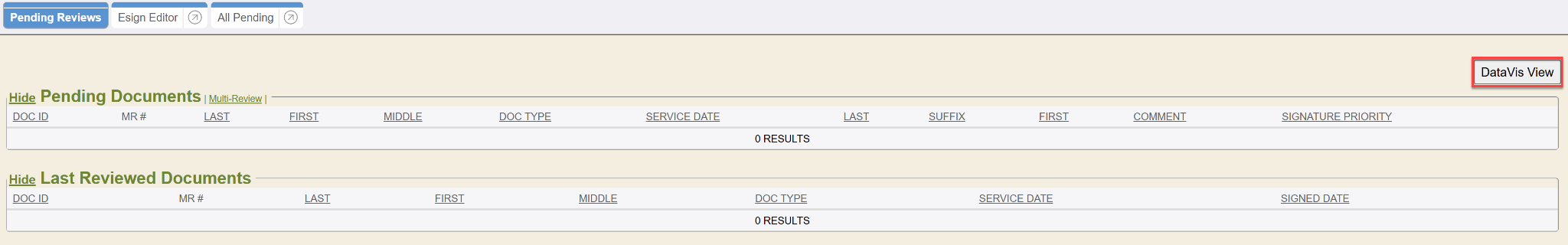 If the My Settings preference to Use DataVis in E-Sign is enabled, users will see the E-sign DataVis on the Pending Reviews tab. The Pending Reviews tab defaults to e-sign requests for the logged in user. If the logged in user has the proper security setting access to view All Pending e-sign requests, then the logged in user may use the User autocomplete to search for another user, then click the Search button to view the other users unsigned e-sign requests. Users can create their own perspective(s) as needed also.