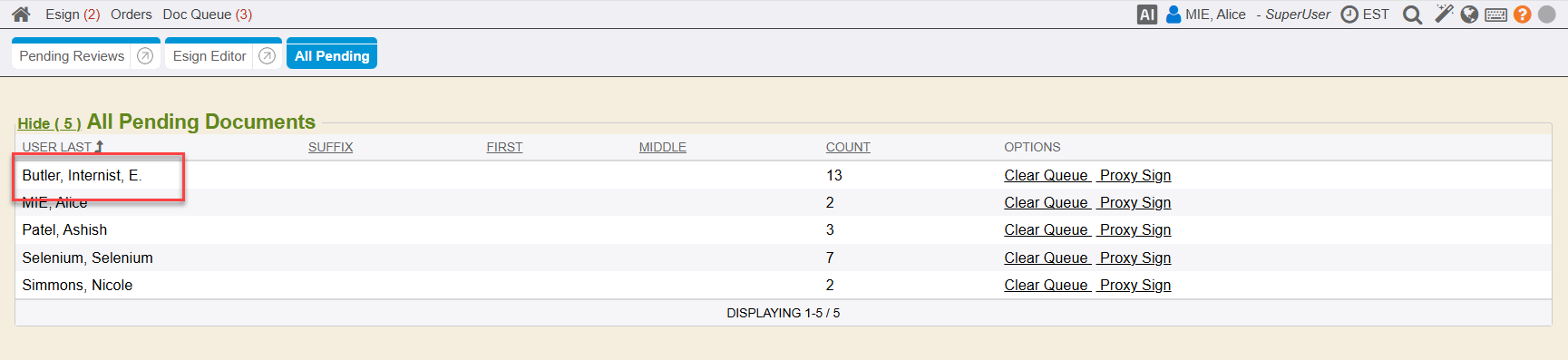 To clear a user’s entire e-sign queue, simply click on the Clear Queue link from the All Pending e-sign tab.