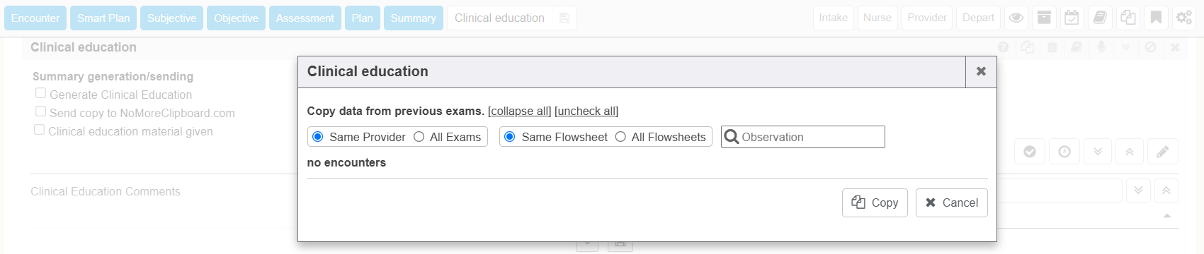 The Copy from Previous Exam icon pops up a window to allow you to select Clinical Education data that you wish to copy from the chart’s prior encounter(s) to this current encounter.