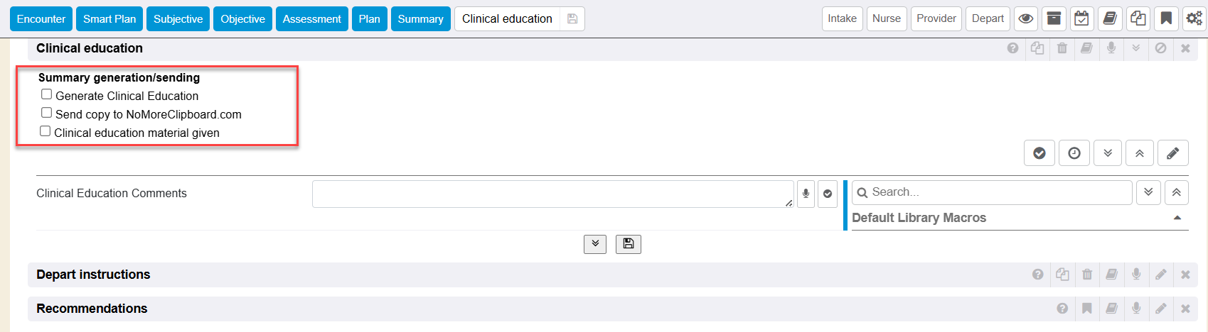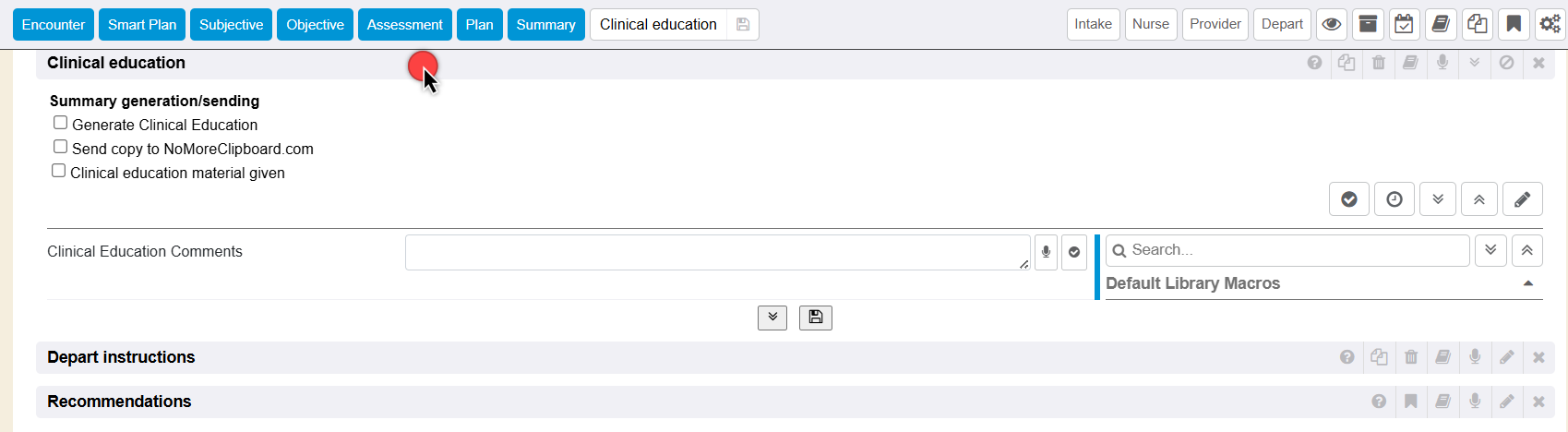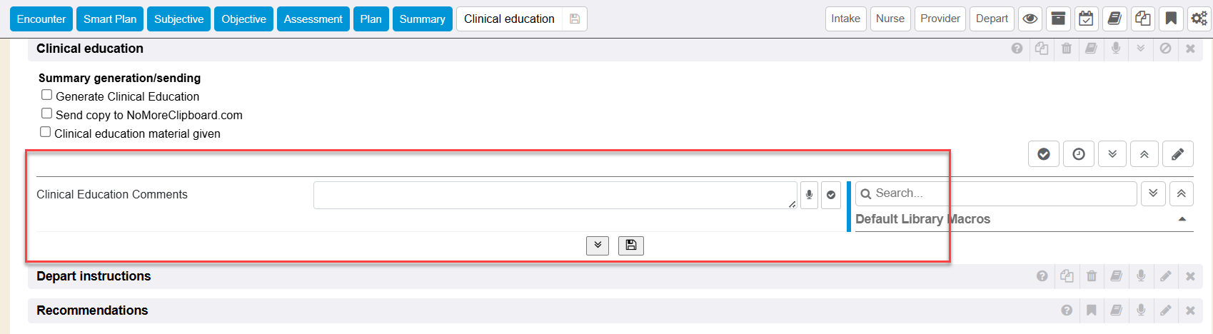 Within the expanded Clinical Education section, there is a free text option to type in comments. Use the free text field, speech to text dictation icon, or use the previous values or library macros on the far right to quickly get the Clinical Education documented. For more information on library macros refer to Libraries.