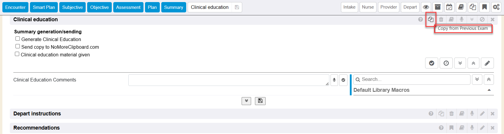 Within the Clinical Education encounter section, there is an icon that offers Copy from Previous Exam functionality.