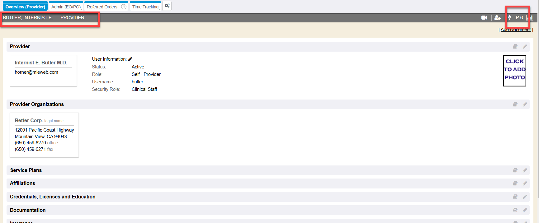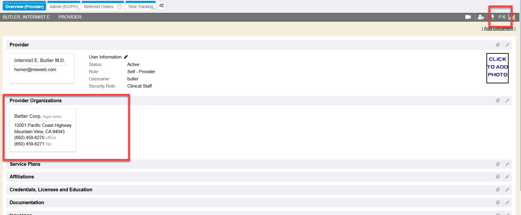 Each provider chart then should be associated with the Provider Organization/Clinic Location chart for which the provider works at/provides services at. For example, Better Corp is a Provider Organization/Clinic Location in the system. Dr Butler practices at Better Corp PO/Clinic Location and the Provider chart is associated to the Provider Organization chart.