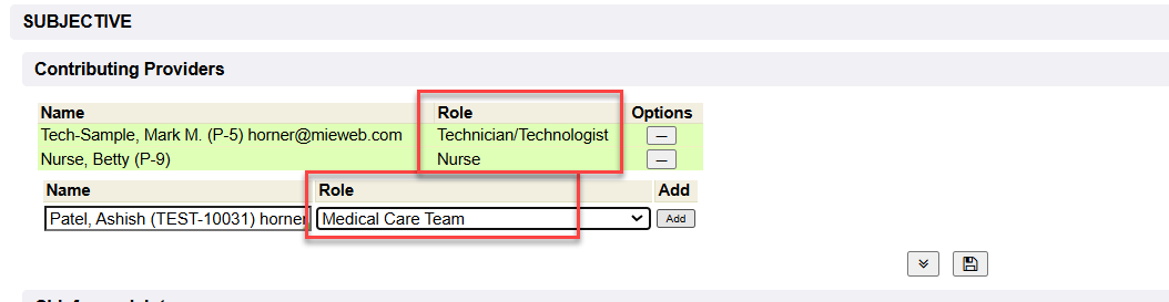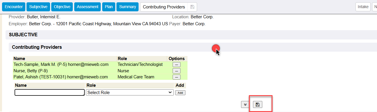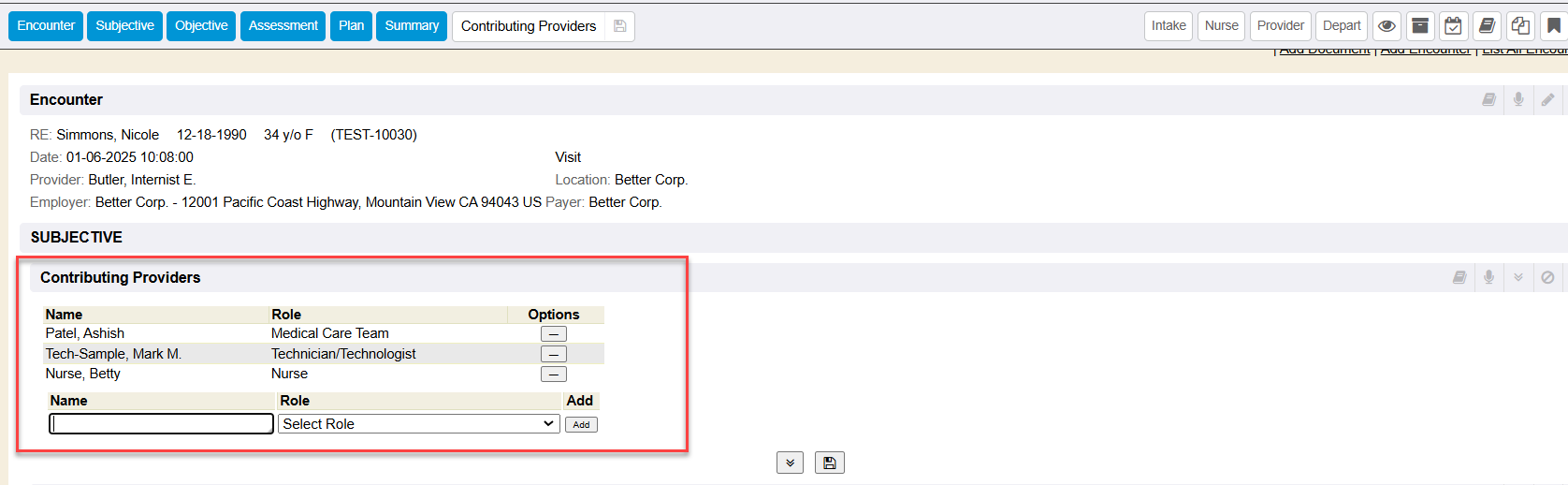 The Contributing Providers section is the ability to add any providers/other staff members to be listed as having contributed to this note/visit, separate from the overall performing provider on the encounter. This allows you to capture any clinic user that participates in the patient’s care. For example, Dr. Butler is the provider seeing the patient, he is listed as the main performing provider in the top Encounter Info section. However, Nurse Betty brought the patient back and took their vitals. Therefore, Nurse Betty could be listed in the contributing providers section. Then, Technician Mark performed an EKG, therefore Technician Mark could be listed in the contributing providers section. To finish up, Dr. Patel was consulted for a second opinion on the EKG and came in and listened to the patient’s chest, therefore Dr Patel could also be listed as a contributing provider.
