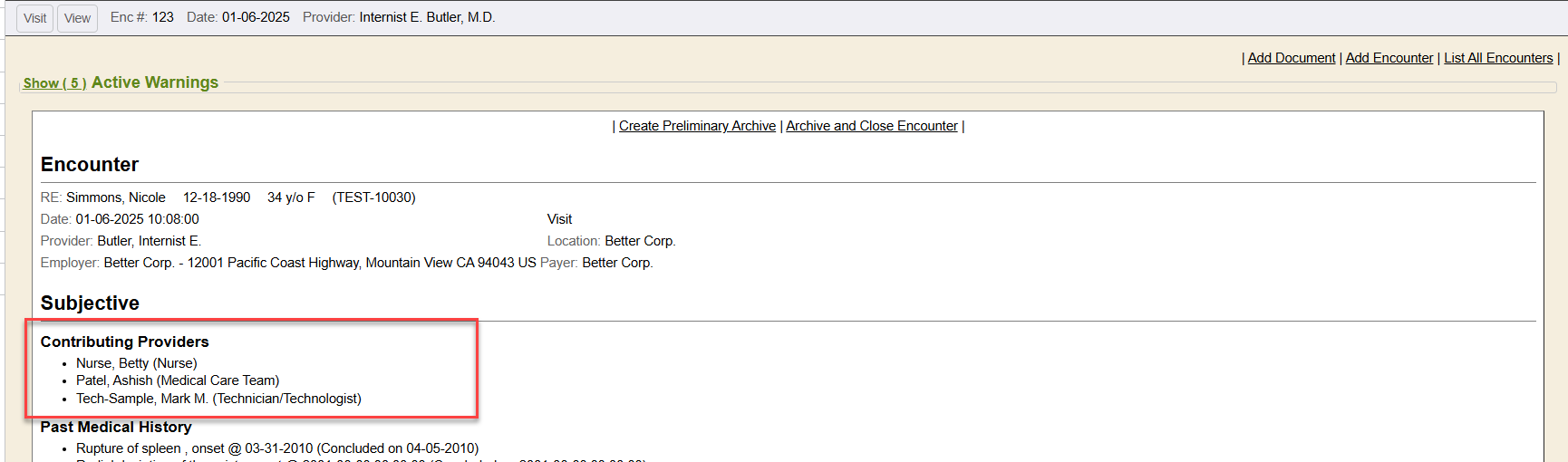 Once the encounter is closed & archived, the stored encounter document will also reflect the Contributing Providers section and its contents.