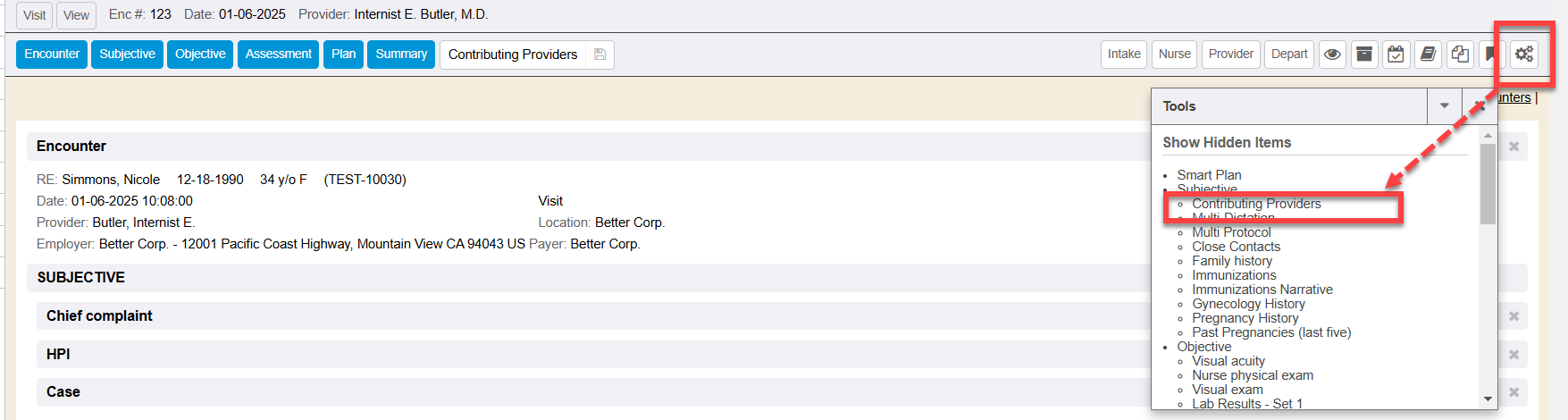 The Contributing Providers encounter section is typically hidden in most default Visit encounter templates/outlines. However, users may add the Contributing Providers encounter section to the encounter visit outline manually by adding it from the encounter Tools.