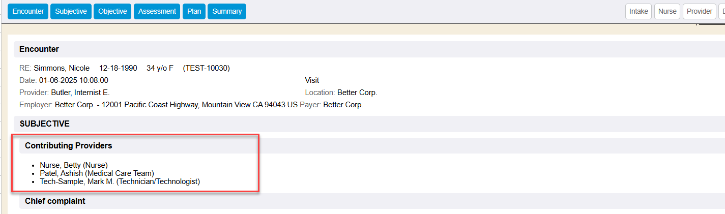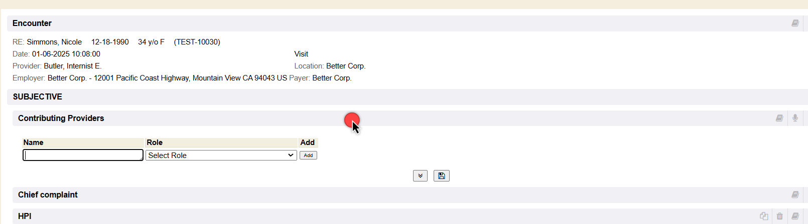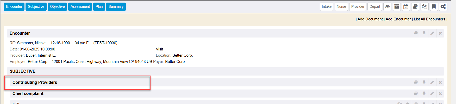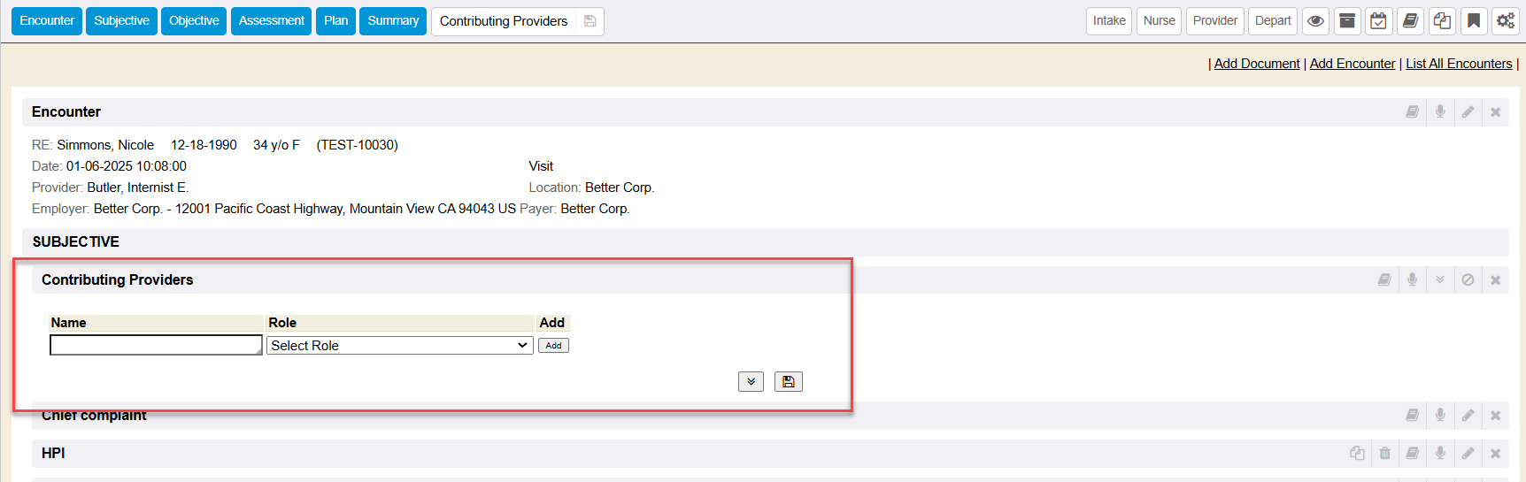 Once added, the Contributing Providers encounter section will display above the Chief complaint encounter section.