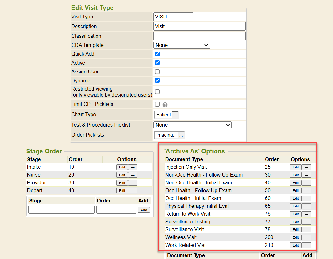 The Archive As field is a set of drop-down choices that the specific encounter visit type (that you are working in) is allowed to be selected to archive as. Archive As choices are configured within the Encounter Types editor of the Control Panel.