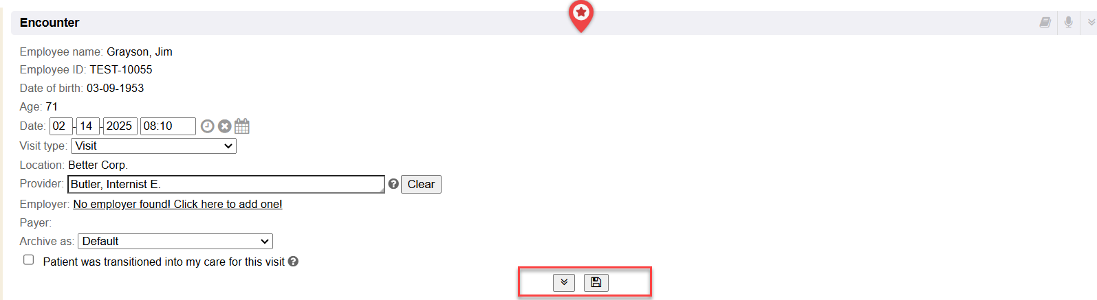 To close the section, simply click anywhere on the grey title bar again or click the Next or Save icon at the bottom of the section. NOTE: The entire encounter outline will refresh automatically when this section is closed and saved. This is on purpose because the rest of the encounter depends on what Visit type is set here and other fields.