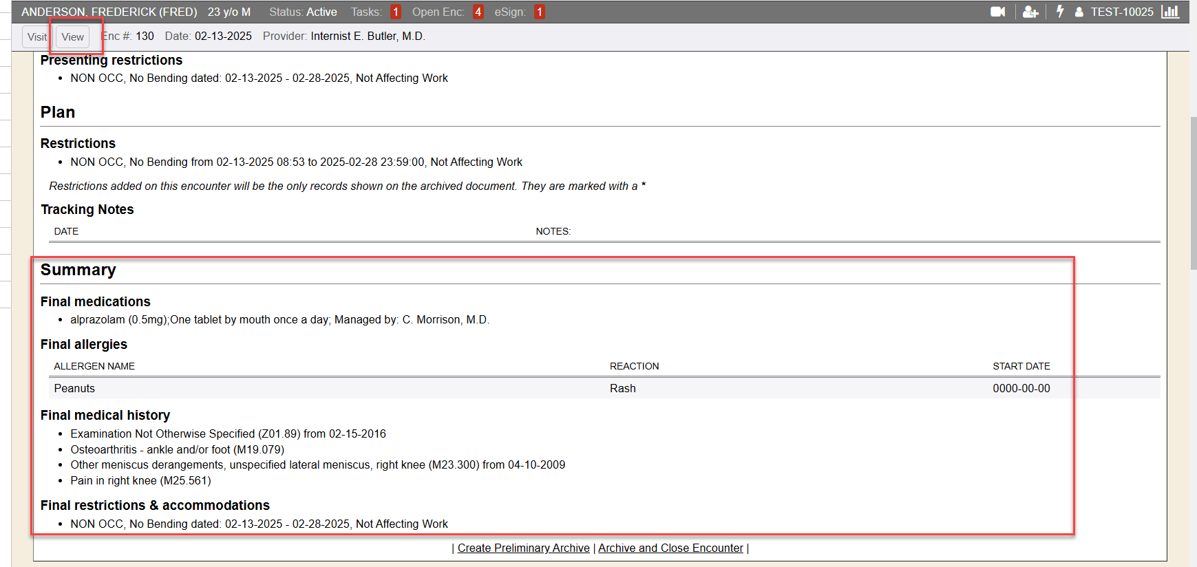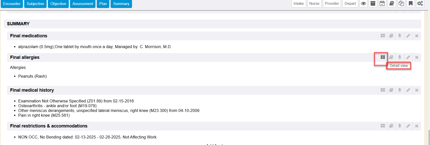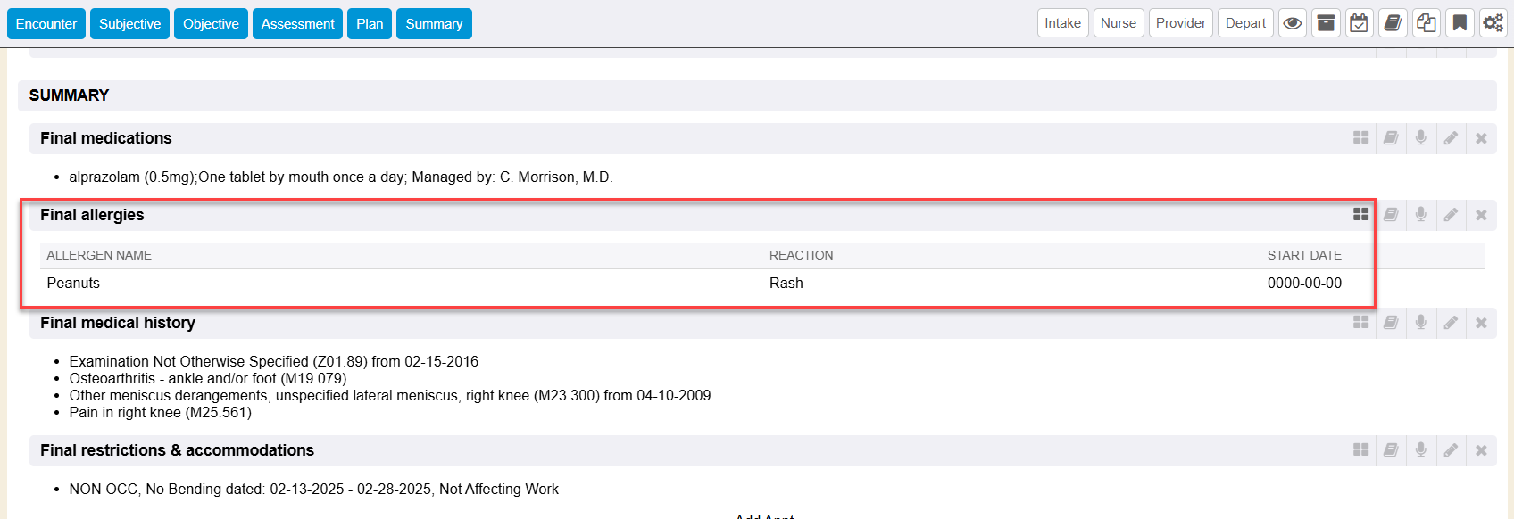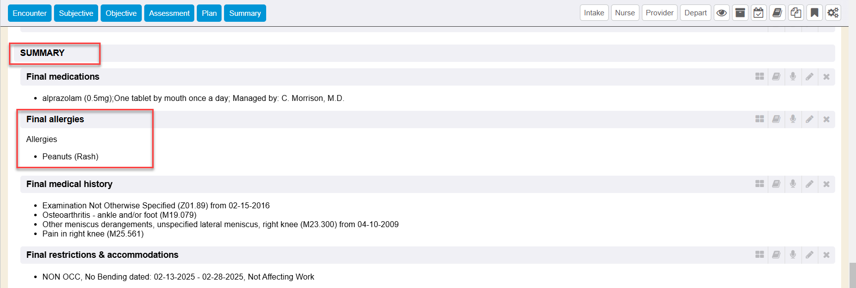 Working in an encounter, there is a Summary section that offers 4 optional sections. The Summary encounter section offers Final Medications, Final Allergies, Final Medical History, and Final Restrictions & Accommodations. These individual sections are optional for use on the encounter and its encounter view and stored/archived document once an encounter is closed & archived.
