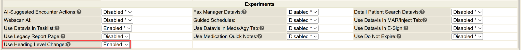 Encounter sections titles can be changed to use different heading levels. To accomplish this, a new preference setting is available under the Experiments section of My Settings.