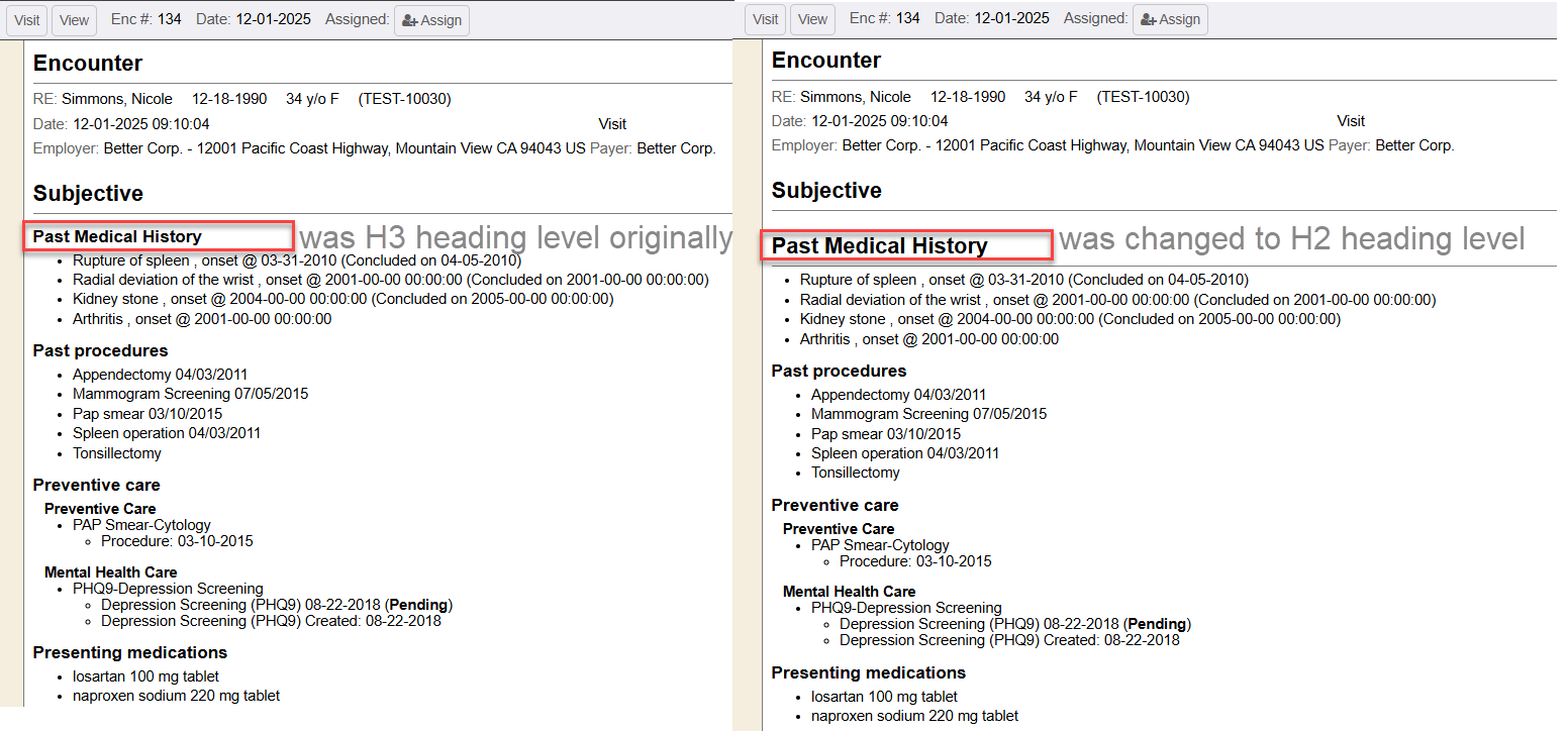 Using header levels helps end-users by creating a clear, hierarchical structure that improves readability and navigability for both human readers and assistive technologies like screen readers. This structured format allows users to quickly scan and jump to specific sections, like patient history, diagnosis, or follow-up care plans, without having to read the entire document, making it easier to find critical information. Upon an encounter being closed and archived, the view and its stored sharable document reflects header levels to make the content of the document more searchable and includes better visual clarity.