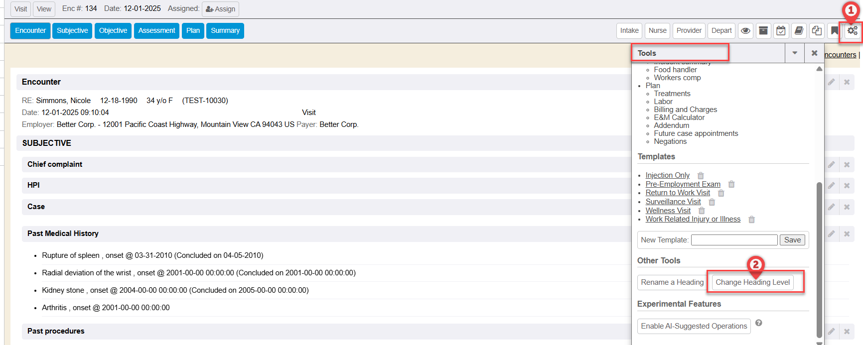 If a user’s Use Heading Level Change preference setting is enabled, when working in an encounter, there will be an option to change Heading Level under Tools.