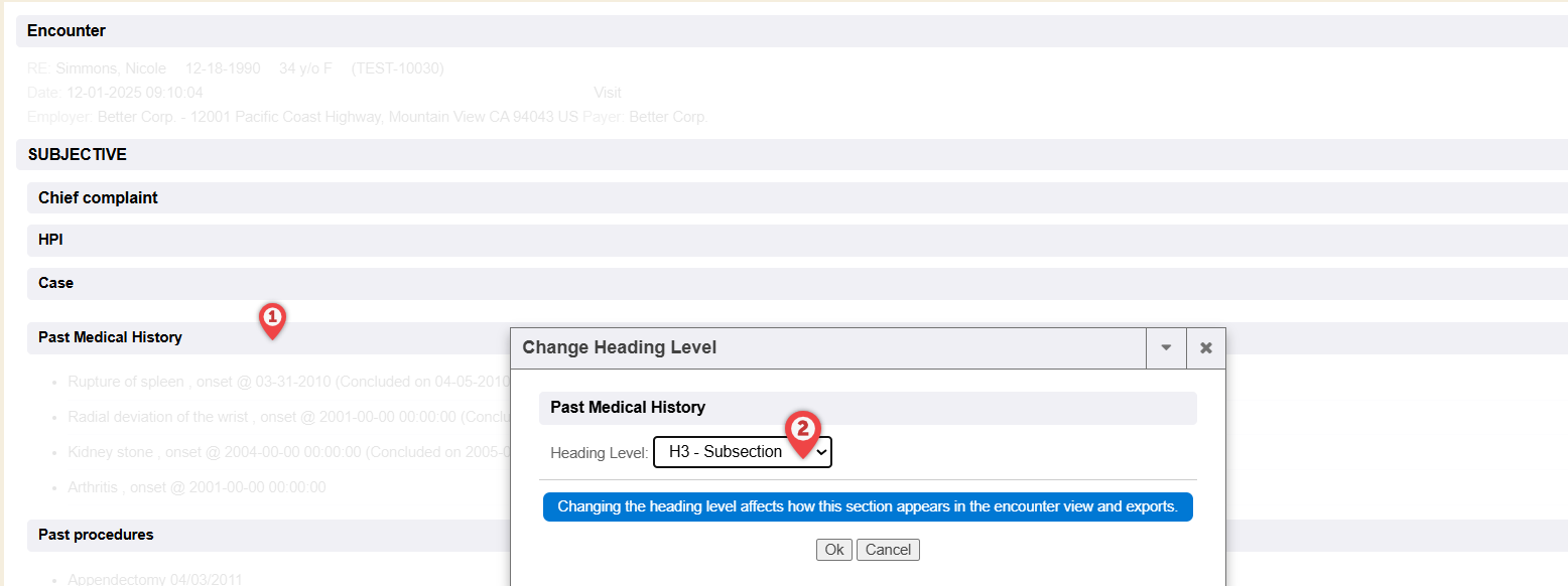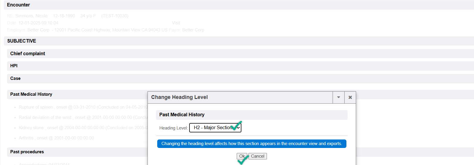 In this example, I have changed the Past Medical History encounter section (for this individual chart’s specific encounter) to be an H2 Major Section level instead of what it was as an H3 subsection level. Upon a drop-down level selection change, click the OK button.