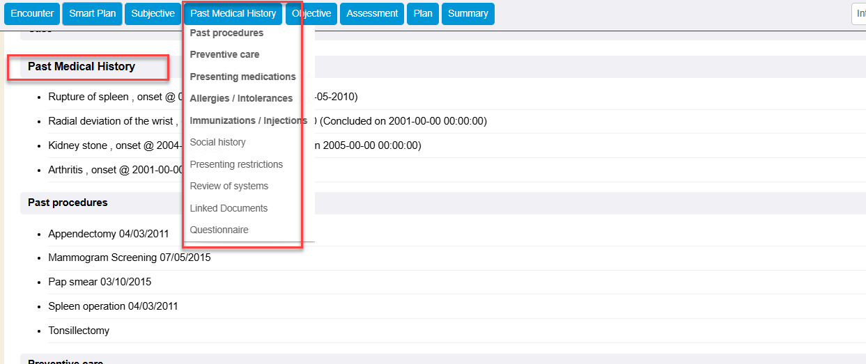 In this example, since we made the Past Medical History encounter section (for this chart’s encounter) an H2 major section, it has made that section also a blue jump button and any encounter sections after that (until the next H2 major section) are now considered subsections of Past Medical History.