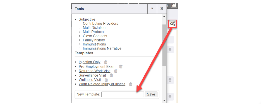 Changes to the Heading Levels can also be saved when utilizing templates. The Tools icon button (within an encounter) gives the ability to enter a template name that you want to save or key in existing name to load. When a user loads a stored/existing template by name, the specific sections will only show that pertain to that template being used.