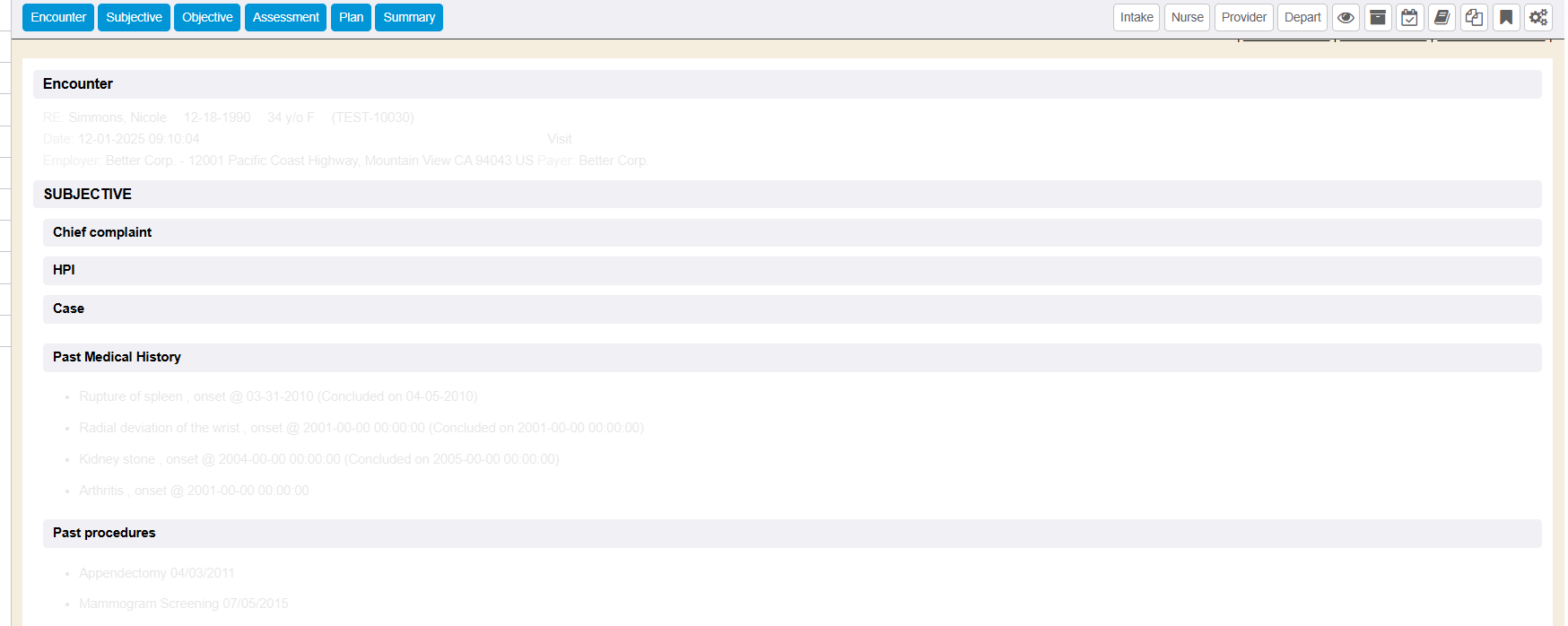 Upon clicking the OK button, the encounter will display the contents and allow you to continue working. Based on the heading level you changed a section to, you will see it as a major section (blue jump button), or as a subsection within a major section (subsections show when hovering over a blue jump button).