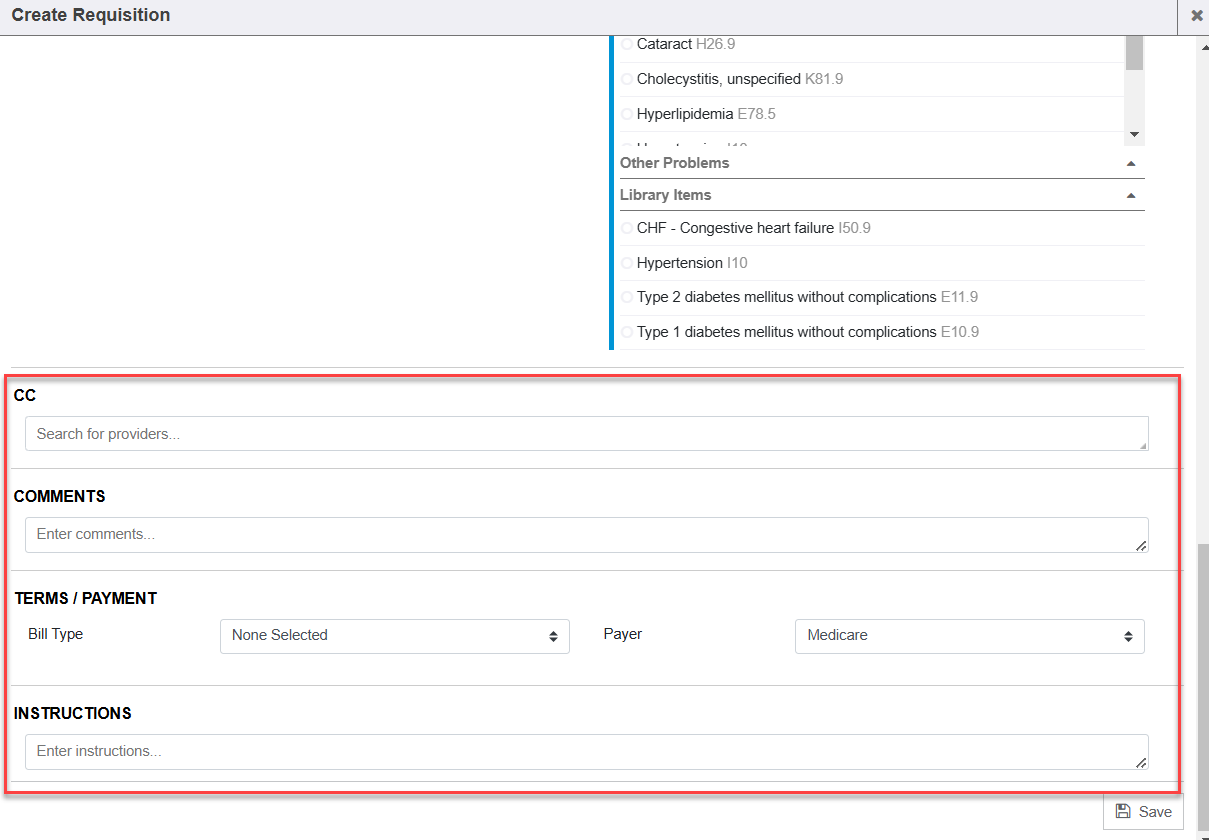 - CC: Can signify a provider to be CC’d. The autocomplete field results any users in the system who are tied to the Referring Physician department in the system’s access control. This info is shown on the stored order document in the CC Physicians section.