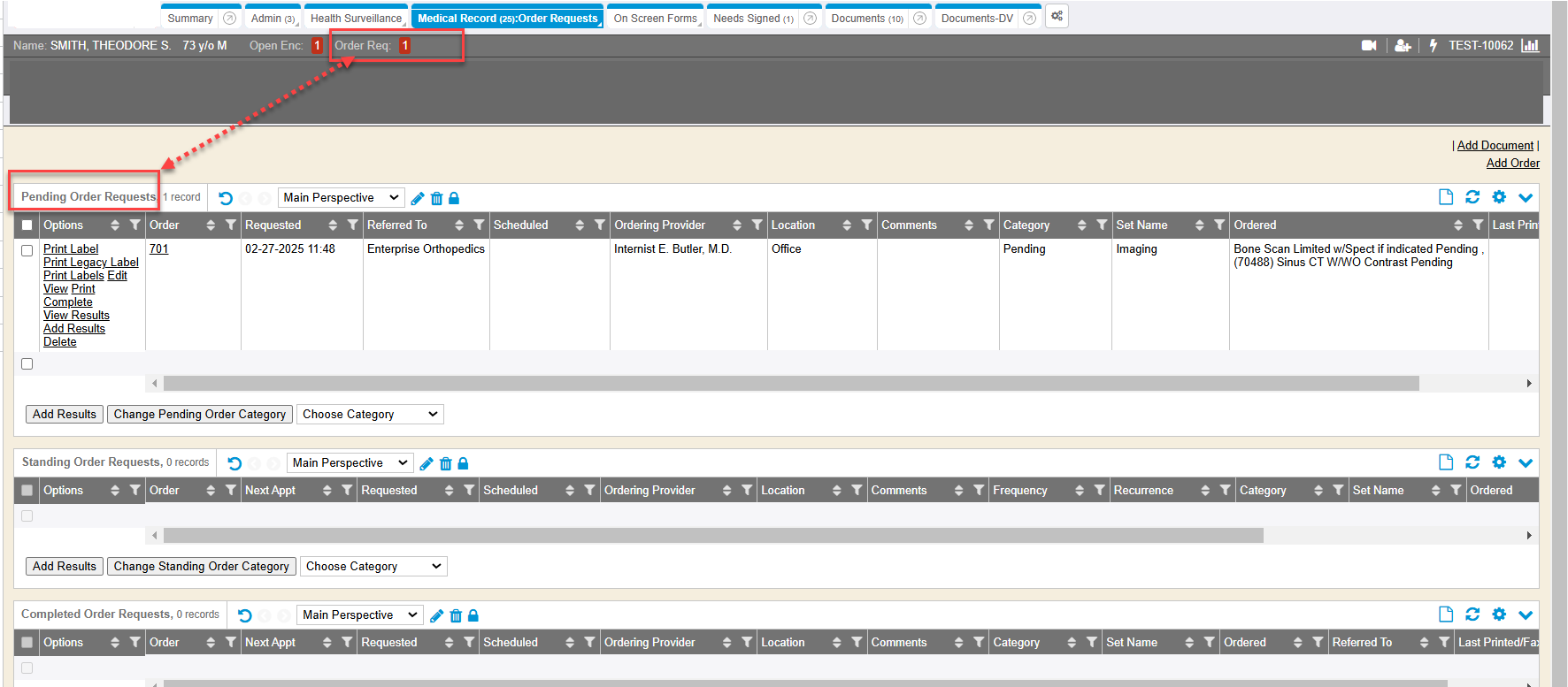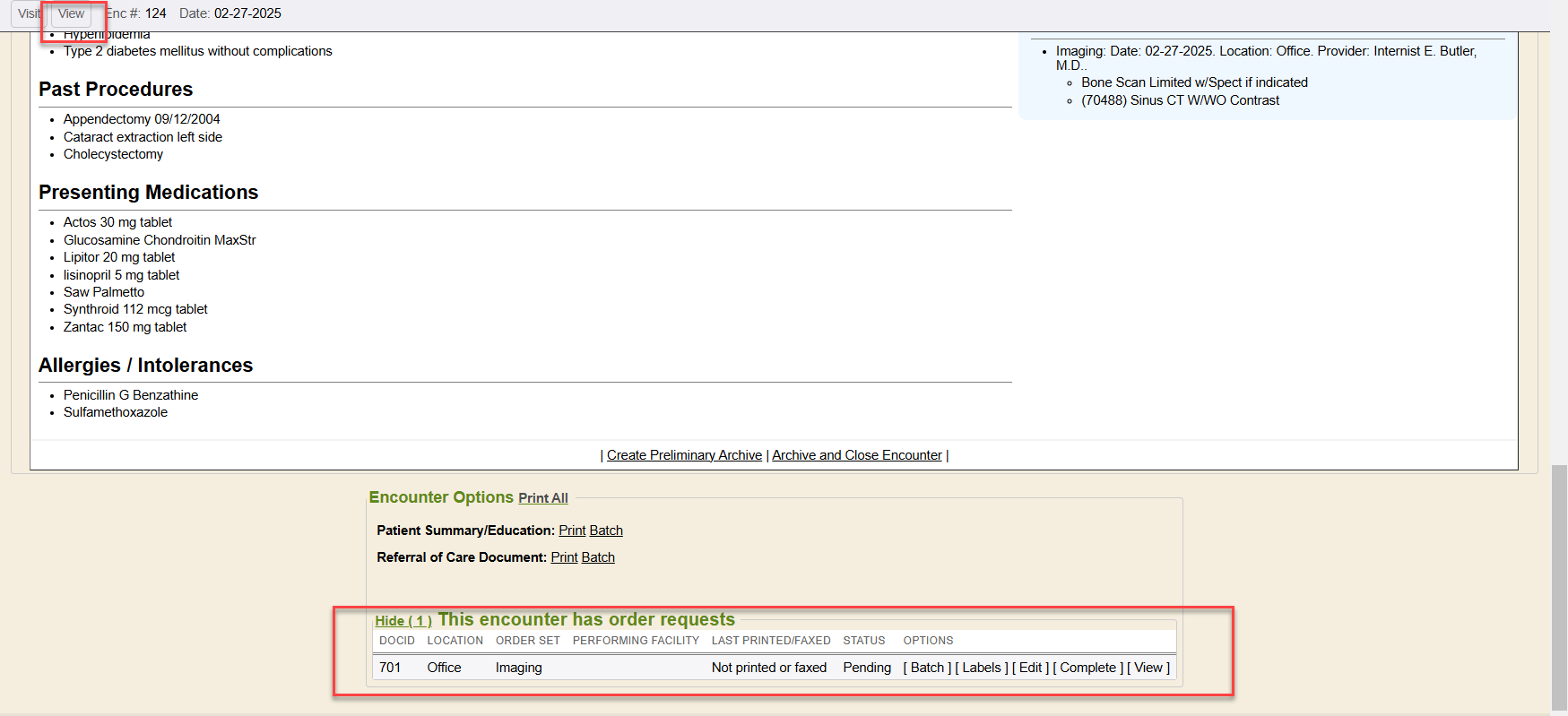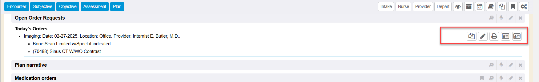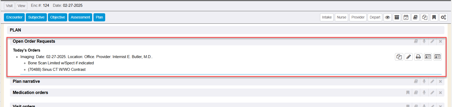If there were any order requests made by the provider, those open pending order requests show on the encounter “view”. The order requisitions are listed in the plan area of the encounter document.
